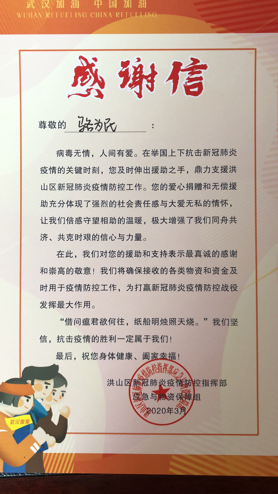 隨著疫情防控形勢持續向好,武漢已經重啟。近日,我司董事長駱為民收到了一封來自洪山區新冠肺炎疫情防控指揮部的感謝信,表達了對董事長駱為民先生誠摯的感謝和敬意。