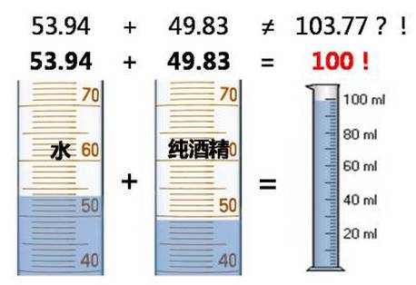 酒,是由乙醇、水及微量物質組成的。但這些物質混合在一起的時候,并非完美的融合。若您將50ml的乙醇與50ml的水混合,你知道會發生什么現象嗎?實際測量容量只有97ml!這是因為,水分子進入了乙醇分子的空隙中。